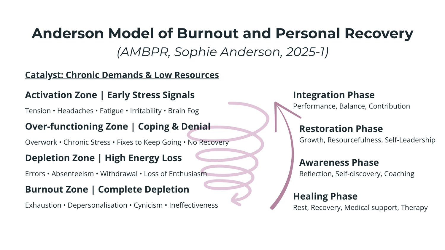 The Anderson Model of Burnout and Personal Recovery™ is a simple, visual, evidence-aligned framework that helps individuals, leaders, and workplaces recognise what’s happening early, take meaningful action, and support recovery at every stage.