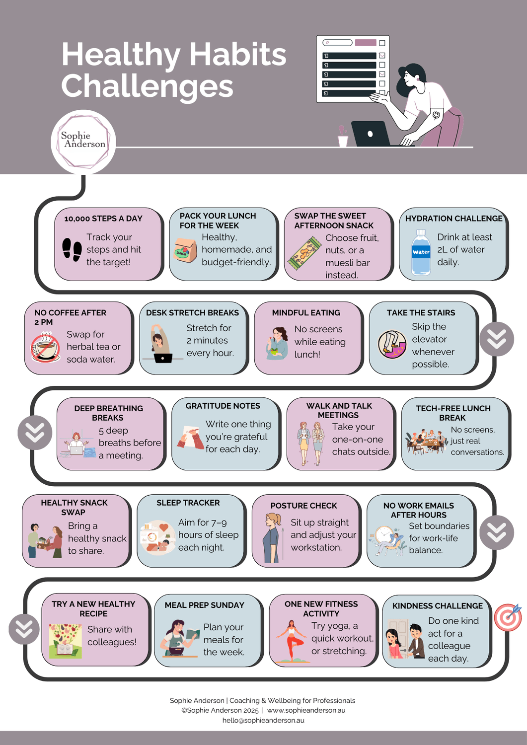 We offer professional coaching packages and workplace presentations & workshops, helping your people be inspired and supported to take charge of their health, reduce stress, and achieve a balanced life.